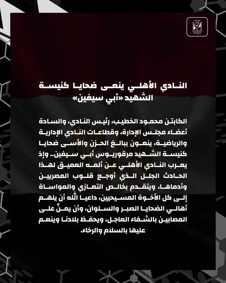 وقال النادي عبر موقعه الرسمي:" الكابتن محمود الخطيب، رئيس النادي، والسادة أعضاء مجلس الإدارة، وقطاعات النادي الإدارية والرياضية، ينعون ببالغ الحزن والأسى ضحايا كنيسة الشهيد مرقوريوس أبي سيفين".