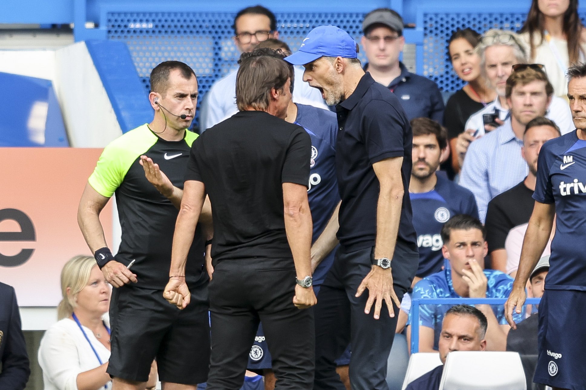 وسبق وأن حدثت أزمة بين المدربين بعد ستجيل توتنهام هدف التعادل لتوتنهام عن طريق بيير إميل هويبيرج في الدقيقة 68 وتم اشهار الكارت الأصفر أمام الثنائي بعدما توقفت المباراة لما يقرب 4 دقائق.