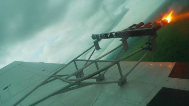 عندما تلقح السحب من القمة، أنت تطير على مسافة 20 ألف قدم حول حافة العاصفة، لتعقب الخلية الرعدية الرئيسية إما ببصرك أو باستخدام الرادار.