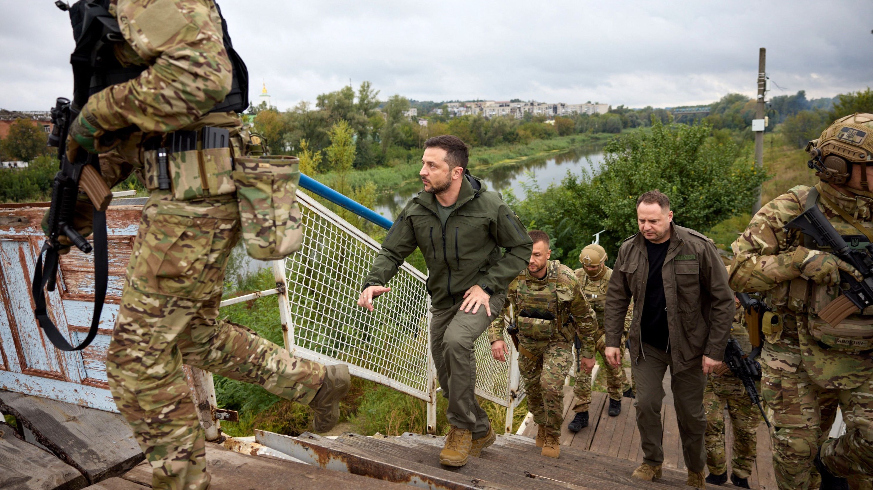 وأظهرت الصور زيلينسكي وهو يقوم بتحية الجنود الأوكرانيين المشاركين في الهجوم المضاد سريع التقدم نحو القوات الروسية.