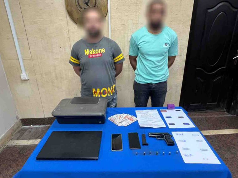 تم تحديد وضبط مرتكبى الواقعة عاطلَين "لهما معلومات جنائية" وبحوزتهما (مستندات منسوبة لإحدى الشركات "مزورة"، جهاز كمبيوتر محمول "لاب توب"، طابعة، 6 أختام منسوبين لجهات مختلفة، طبنجة صوت، طلقات- مبلغ مالى "متحصلات نشاطهما الإجرامى").