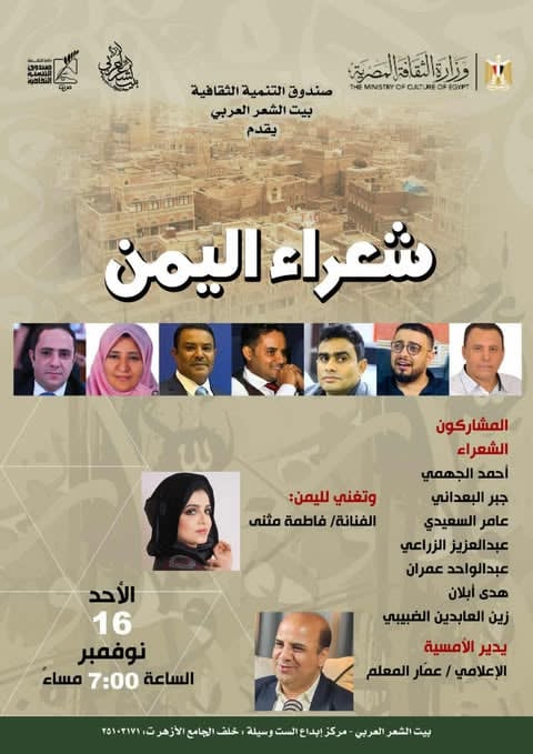 ينظم بيت الشعر العربي بمقره في مركز إبداع الست وسيلة خلف الجامع الأزهر، أمسية شعرية وفنية بعنوان "شعراء اليمن"، وذلك في السابعة مساء الأحد 16 نوفمبر، في إطار الدور الثقافي الرائد الذي يضطلع به صندوق التنمية الثقافية في دعم الإبداع العربي وتعزيز الحوار الثقافي بين الشعوب.