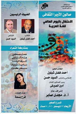يحتفل صالون الأوبرا الثقافي باليوم العالمي للغة العربية، وذلك من خلال ندوة خاصة عن جماليات لغة الضاض، التي تقام في 7 مساء الأربعاء الموافق 23 ديسمبر الجاري في المسرح الصغير بدار أوبرا القاهرة، مع الالتزام بالإجراءات الاحترازية الخاصة بمواجهة انتشار فيروس كورونا.