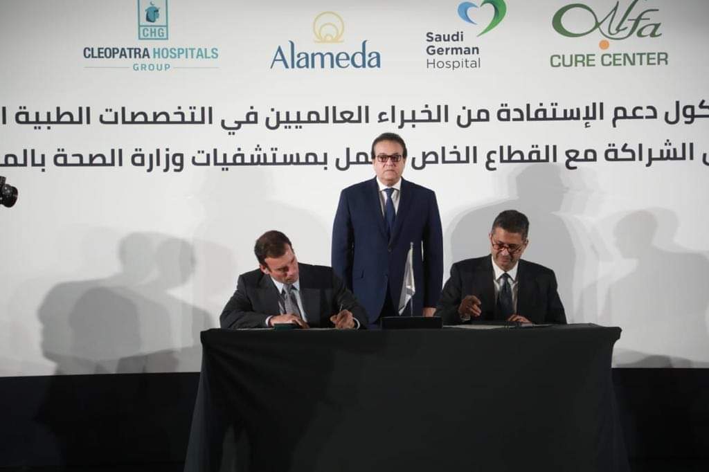 وقع البروتوكول عن وزارة الصحة والسكان، الدكتور هشام زكي رئيس الإدارة المركزية للمؤسسات غير الحكومية والترخيص، وعن مستشفى السعودي الألماني – مصر، الدكتور محمد حبلص المدير التنفيذي للمجموعة، وعن آلاميدا للرعاية الصحية الدكتور فهد خاطر رئيس مجلس إدارة المجموعة، وعن مركز ألفا كيور لعلاج الأورام الدكتور هشام الغزالي مؤسس المركز، وعن مستشفيات كيلوباترا الدكتور أحمد عزالدين الرئيس التنفيذي والعضو المنتدب للمجموعة، بحضور عدد من القيادات ورؤساء الهيئات والقطاعات بالوزارة.