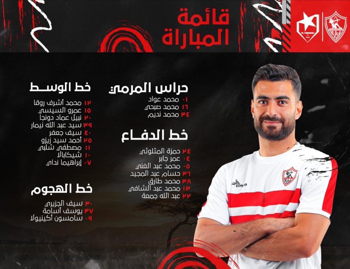 وشهدت القائمة غياب كلا من محمود حمدي الونش وأحمد فتوح لعدم جاهزيتهم للمباراة بالإضافة إلى مصطفى الزناري الذي يعاني من إصابة بشد في العضلة الخلفية، كما شهدت القائمة عودة عمر جابر بعد تعافيه من الإصابة العضلية التي تعرض لها خلال مباراة شباب بلوزداد الجزائري.