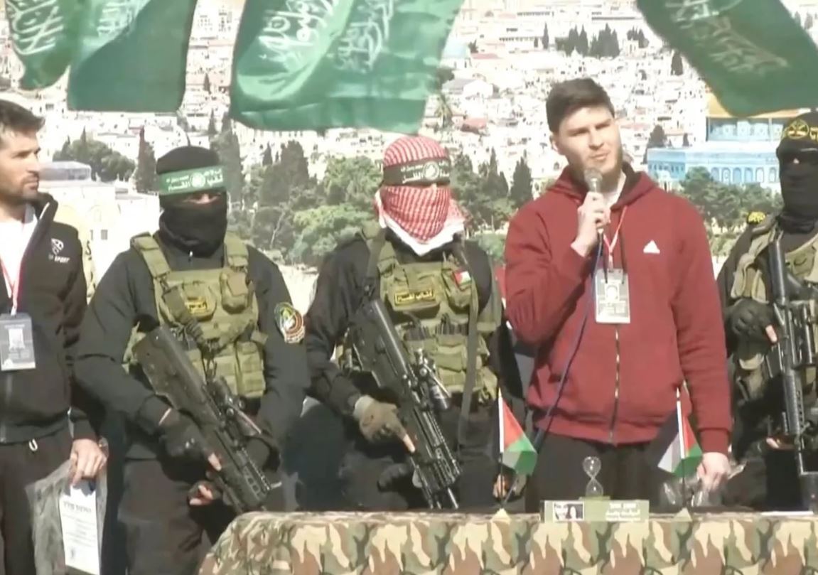 وبعيد وصولهم إلى المكان المخصص، صعد المحتجزون الثلاثة برفقة مقاتلي القسام وسرايا القدس على المنصة، حيث تمت مراسم التسليم,