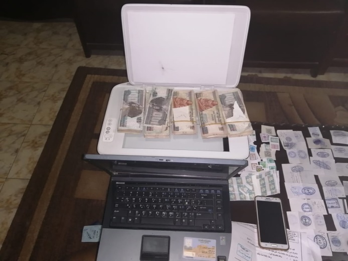 وبتقنين الإجراءات بالتنسيق مع قطاعى الأمن الوطنى والأمن العام بقيادة اللواء علاء الدين سليم ، ومديرية أمن كفرالشيخ تم إستهداف المتهم وبتفتيشه مسكنه عثر على (لاب توب بطابعة ألوان خاصة بتشغيله، و13 قالب لأختام مقلدة لجهات مختلفة "هيئات، مكاتب، مدارس، توكيل ملاحى"، و67 بصمة لخاتم شعار الجمهورية لجهات مختلفة يستخدمها المتهم فى مهر المستندات الرسمية والعرفية من خلال وسيط كربوني، و24 بصمة لخاتم سفر ووصول منسوبة لإحدى الجهات، معاهد تعليمية، كود رقمى للكليات، أختام مراكب وسفن تجارية أجنبية، أختام لإحدى الموانئ، توكيلات ملاحية، مصايد جميعها مقلده).