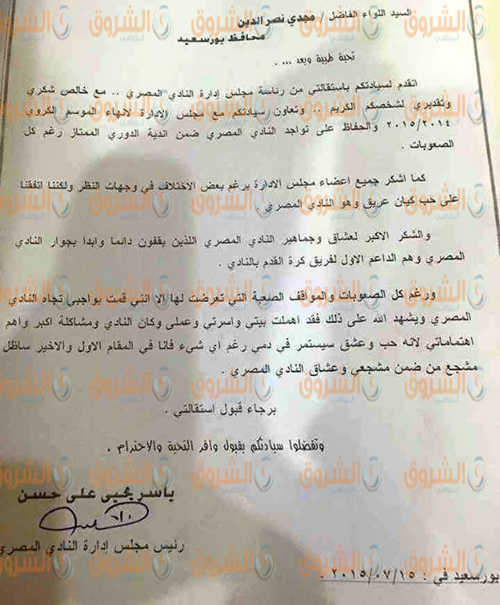 أعلن ياسر يحيى رئيس النادى المصرى التقدم بإستقالته من منصبه فى الساعات الاولى من اليوم حيث توجه رئيس المصرى إلى اللواء مجدى نصر الدين محافظ بورسعيد ومن ثم إلى مديرية الشباب والرياضة لتسليم إستقالته .