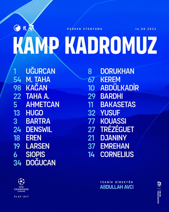 أعلن عبد الله أفسي، المدير الفني لطرابزون سبور التركي، قائمة فريقه لمباراة كوبنهاجن الدنماركي، غدًا الثلاثاء، على باركن ستاديون، في ذهاب تحديد المتأهل لدور المجموعات بدوري أبطال أوروبا 2023/2022.