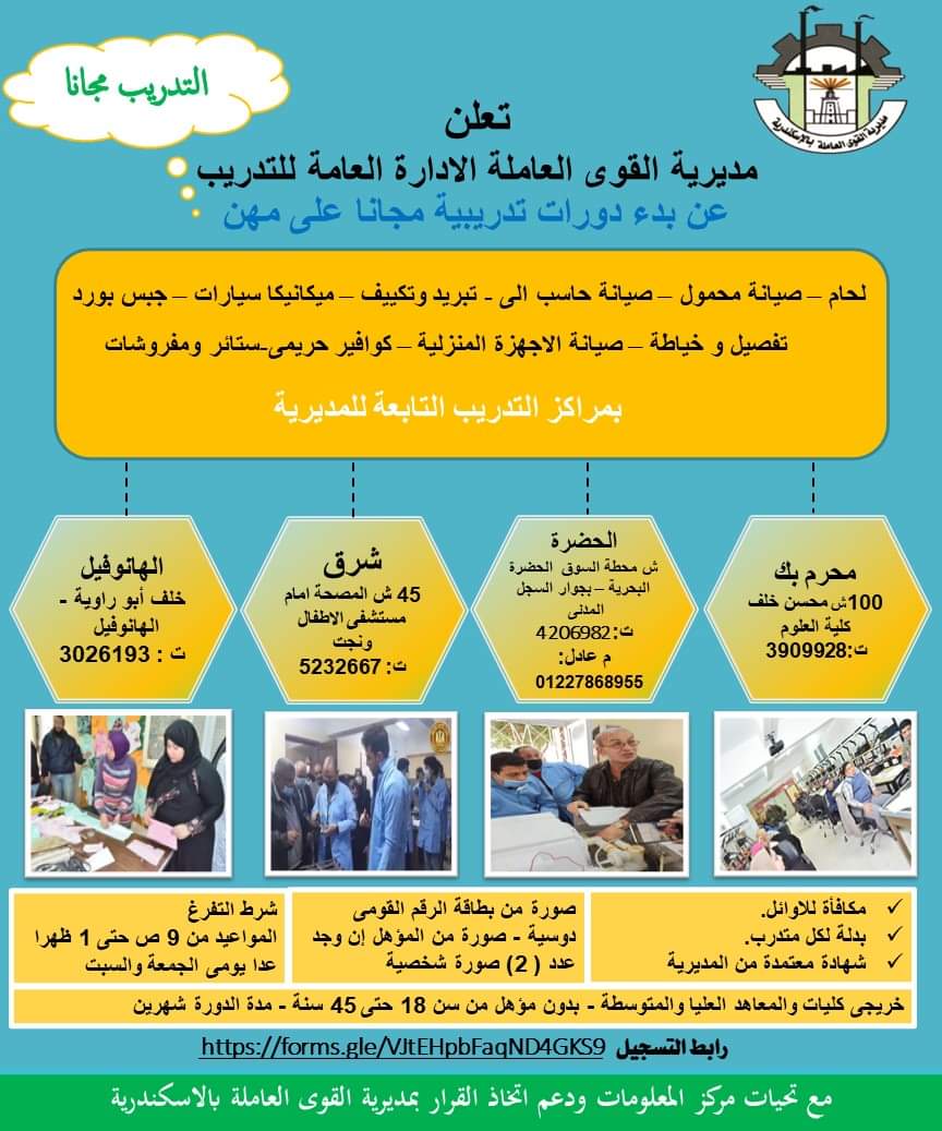 بدأت مديرية القوى العاملة بالإسكندرية برامج التدريب المهني على 10 مهن يحتاجها سوق العمل بالمحافظة، وذلك بمراكز التدريب المهني الثابتة بمحرم بك والهانوفيل وشرق والحضرة، ووحدة التدريب المتنقلة، وذلك بعد اعتماد خطة التدريب المهني للعام 2022 -2023.