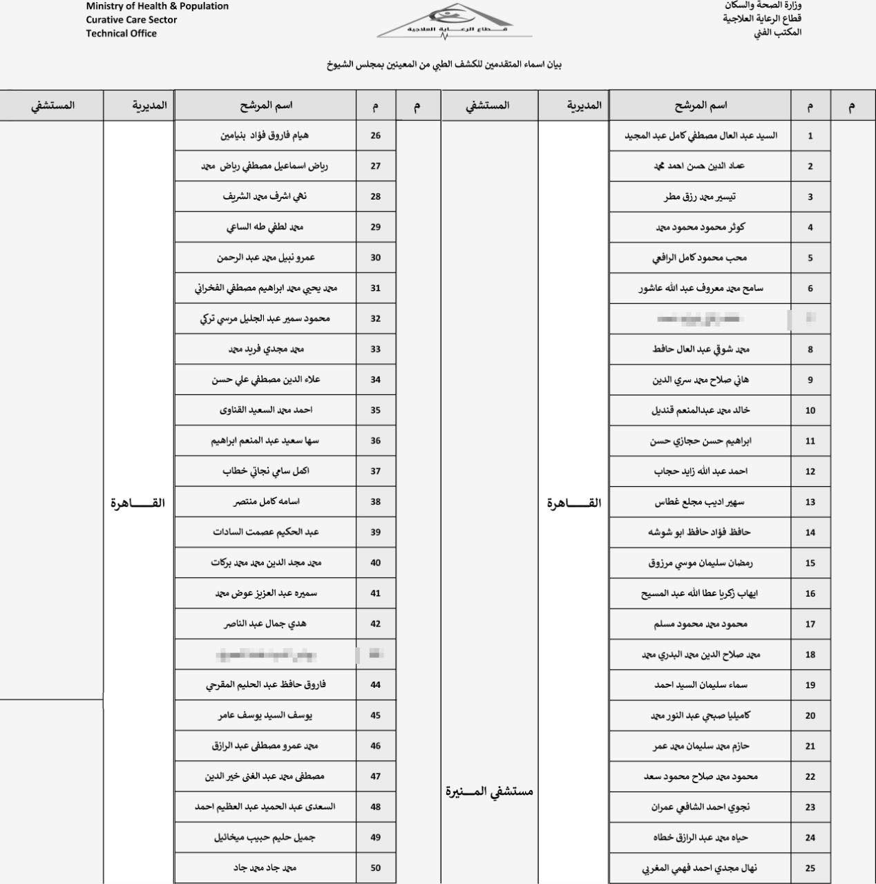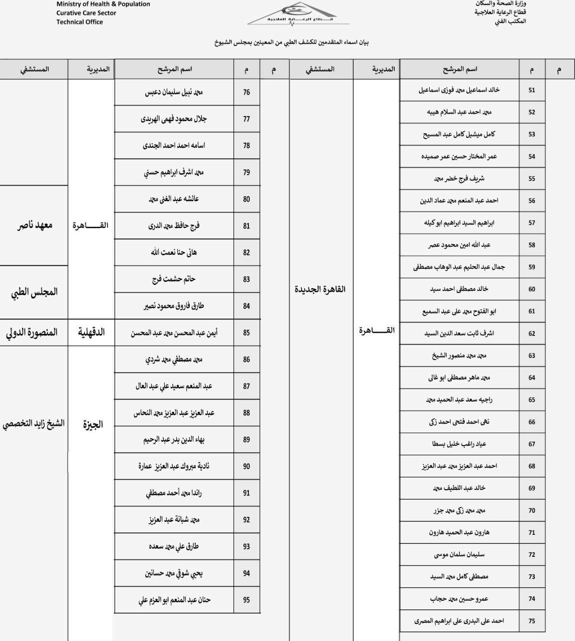 وفيما يلي بيان بأسماء جميع المرشحين للتعيين مقسمين حسب مكان إجراء الكشف الطبي عليهم
