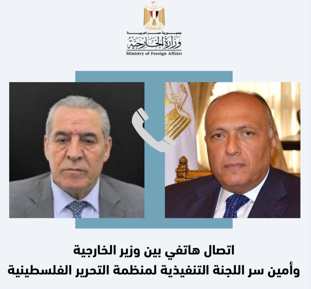 صرَّح السفير أحمد أبو زيد المتحدث الرسمي باسم وزارة الخارجية، بأن سامح شكري وزير الخارجية تلقى اتصالاً هاتفياً، اليوم، من حسين الشيخ أمين سر اللجنة التنفيذية لمنظمة التحرير الفلسطينية.