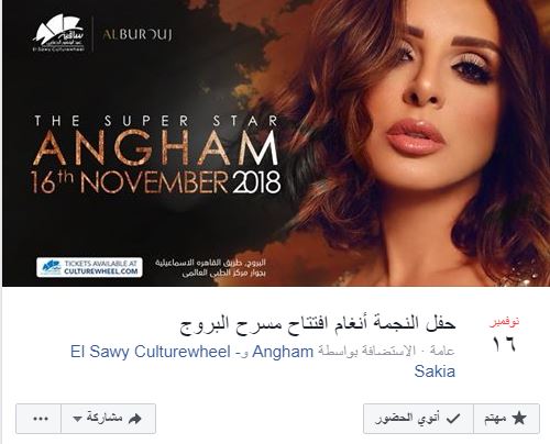 تحيي المطربة أنغام حفلًا غنائيًا في السابعة من مساء الغد، على مسرح البروج بساقية عبد المنعم الصاوي، بطريق الإسماعيلية، ضمن حفلات افتتاح مسرح البروج الجديد.