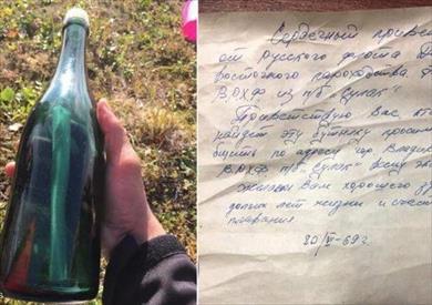 • أما القصة الثانية فكانت لمدرس أمريكي يدعى «تايلر إيفانوف»، وقد عثر على زجاجة شمبانيا بداخلها رسالة، أثناء جمعه الحطب لتدفئة أطفاله على شاطئ يقع في غرب ألاسكا. وكانت الرسالة مكتوبة بخط اليد باللغة الروسية، والتي تعود تاريخها لعام 1969؛ حيث كتب بداخلها «تحيات حارة من أسطول الشرق الأقصى الروسي، نتمنى لكم صحة جيدة وعمراً مديداً وإبحاراً سعيداً»؛ وقد اتضح أن من كتب الرسالة طاقم «سولاك» وهي واحدة من سفن أسطول الصيد في الشرق الأقصى الروسي.