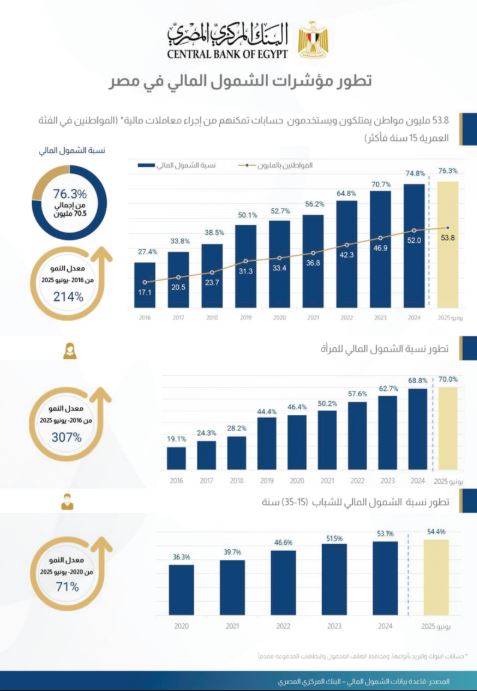 بلغ معدل نمو الشمول المالى نسبة 214% خلال الفترة من 2016 حتى يونيو 2025، مما يعكس زيادة استفادة المواطنين من الخدمات المالية.