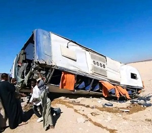 وأكد مصدر أن الحافلة في أثناء طريقها للعودة إلى أسوان عبر الطريق الصحراوي الغربي في مدينة إسنا انفجرت إحدى إطاراتها مما أدى إلى اختلالها فانقلابها على جانبي الطريق.