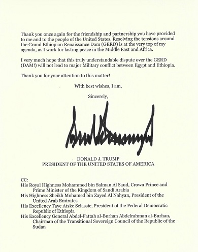 أتقدم إليكم مجددًا بجزيل الشكر على الصداقة والشراكة التي قدمتموها لي ولشعب الولايات المتحدة. إن حل التوترات المحيطة بسد النهضة الإثيوبي الكبير على رأس أولوياتي، إذ أسعى جاهدًا لتحقيق سلام دائم في الشرق الأوسط وأفريقيا.