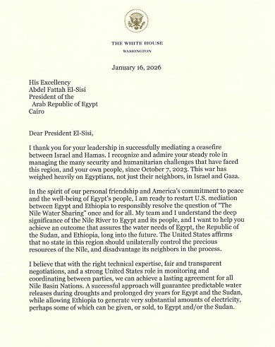 وانطلاقاً من روح صداقتنا الشخصية والتزام أمريكا بالسلام ورفاهية الشعب المصري، فأنا على استعداد لاستئناف الوساطة الأمريكية بين مصر وإثيوبيا لحل مسألة "تقاسم مياه النيل" بشكل مسؤول ونهائي. يُدرك فريقي وأنا الأهمية البالغة لنهر النيل لمصر وشعبها، وأرغب في مساعدتكم على تحقيق نتيجة تضمن تلبية احتياجات مصر وجمهورية السودان وإثيوبيا من المياه على المدى البعيد. وتؤكد الولايات المتحدة أنه لا ينبغي لأي دولة في هذه المنطقة أن تسيطر بشكل منفرد على موارد النيل الثمينة، وأن تُلحق الضرر بجيرانها في هذه العملية.