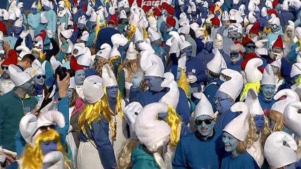 تجمع 2762 شخصا يضعون مكياجا باللون الأزرق ويرتدون قبعات بيضاء في جنوب ألمانيا، اليوم السبت، لهدف واحد: تحطيم الرقم القياسي العالمي لأكبر تجمع من السنافر.