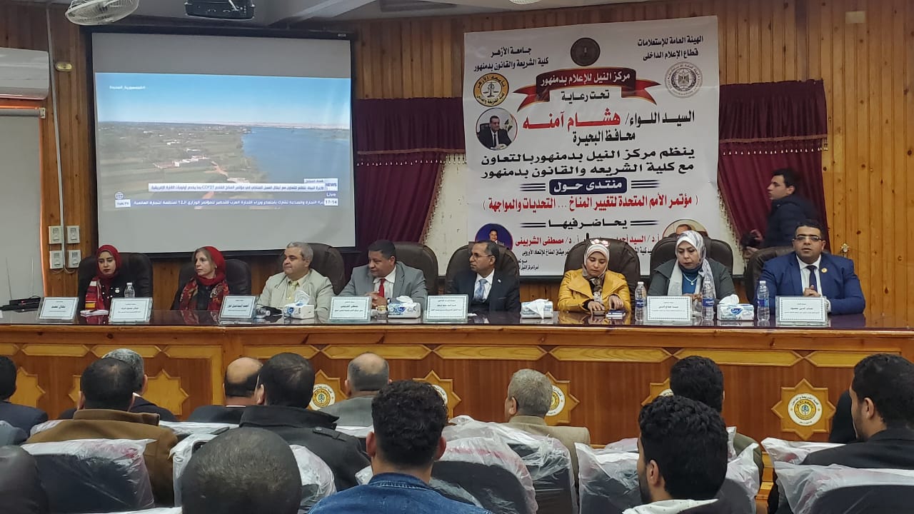 نظمت الهيئة العامة للاستعلامات ممثلة في مركز النيل للإعلام بدمنهور بالتعاون مع كلية الشريعة والقانون بدمنهور تحت رعاية اللواء هشام آمنه محافظ البحيرة والدكتور محمد حسين المحرصاوي رئيس جامعة الأزهر مؤتمراً علمياً تحت عنوان "التغيرات المناخية.. التحديات والمواجهة"، ضمن فعاليات مبادرة المليون شاب متطوع للتكييف المناخي.