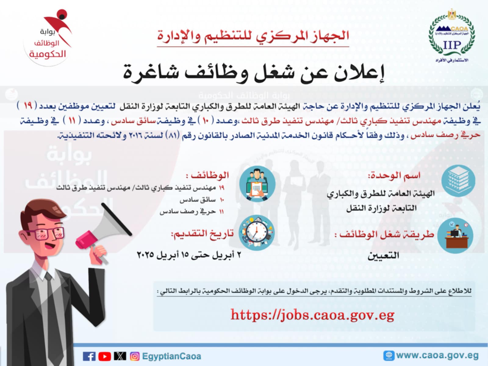 يُعلن الجهاز المركزي للتنظيم والإدارة، برئاسة الدكتور صالح الشيخ، عن حاجة الهيئة العامة لتخطيط مشروعات النقل التابعة لوزارة النقل إلى تعيين عدد (6) في وظيفة (أخصائي حاسبات آلية) بالمستوى الوظيفي الثالث، وذلك وفقًا لأحكام قانون الخدمة المدنية الصادر بالقانون رقم (81) لسنة 2016 ولائحته التنفيذية.