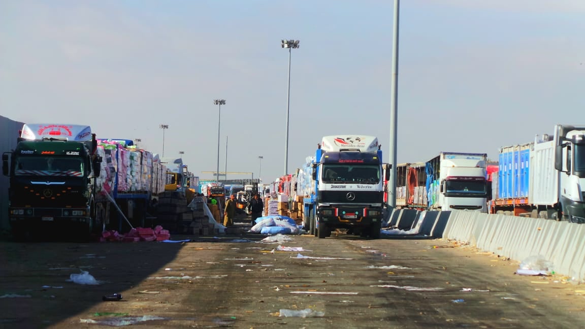 دخلت اليوم الاثنين دفعات جديدة من شاحنات المساعدات من خلال بوابة جانبية عند معبر رفح البري، في طريقها إلى معبر كرم أبو سالم لتسليمها للجهات الفلسطينية الإغاثية.