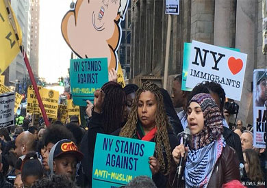 وشهدت نيويورك يوم الخميس (14 أبريل / نيسان 2016)، أكبر مسيرة احتجاجية ضد ترامب. فبينما كان الحزب الجمهوري يقيم وجبة عشاء لجمع التبرعات لأبرز مرشحيه داخل أحد الفنادق في مانهاتن، بدا واضحا أن هذه الحركة الاحتجاجية لا يمكن القضاء عليها بسرعة. فالكثير من المهاجرين والأمريكيين أعلنوا الحرب على ترامب وأتباعه. "لم أعد أستطيع تحمل سماع خطاب الكراهية هذا"، يقول الشاب ميكائيل بيريرا، الذي يضع لوحة حول عنقه صممها بنفسه، يعبر فيها بوضوح عن رفضه للعنصرية وكراهية النساء.