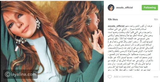 أصالة كتبت: "عرفت أن أكون اثنتين واحده منهم أصاله والثانيه صولا ... الأولى هي التي تحمَّلت وانجرحت وهي التي كثيراً بكت وظُلمت ونفسها نَست وحين تغنّي أصاله أتعلَّق بها حبّاً وتعاطفاً وفخراً وكأنني حتى أصبح في هذه اللحظه أحداً ثالثاً ، خُلق ليستمع لصوتها ليس إلّا ، وحين أعيش وكلّ كياني واحداً وهو ( أصاله) أتعب وأقترب لأن أستسلم حتى للموت ... وكي أُكمل وكي أتفاعل مع الفرح اخترعت ( صولا) فأصبحت الثانية دواء الأولى فصولا قويّه لا ترضى بالظلم ولا تقبل الحزن وصوت ضحكتها عالٍ وحضنها أمان للجميع ، تؤمن بمعجزات الحب ، حدسها أصدق لأنّه غير ملوّث بالأحزان ، واليوم في عيد أصاله أتمنّى لها أن تتوّحد مع توأمها حتّى ولو كان هذا اليوم ليس بقريب ، وأن يديم عليها نعمة محبّة من اختارتهم الحياة لها أهل ومن اختارتهم هي ليكونوا أهلها ، وألف شكر لكلّ من دعم موهبتها فأعانها لتتجاوز مصاعب الحياة ، وألف شكر لكلّ من لم يُخطئ في فهمها ولم يجرحها ولم يظلمها ، وكوني اخترت صولا لتعايدني أرجوها أن تبقى معي ما استطاعت كي أنشر معها الفرح الذي نحتاجه والأمان الذي نرجوه والحب الذي نحلم به".