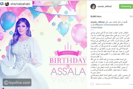 شاهدي أيضاً: صور ابنة أصالة تعايدها بكلمات مؤثرة في عيد ميلادها والنشطاء يطلبونها بالترجمة