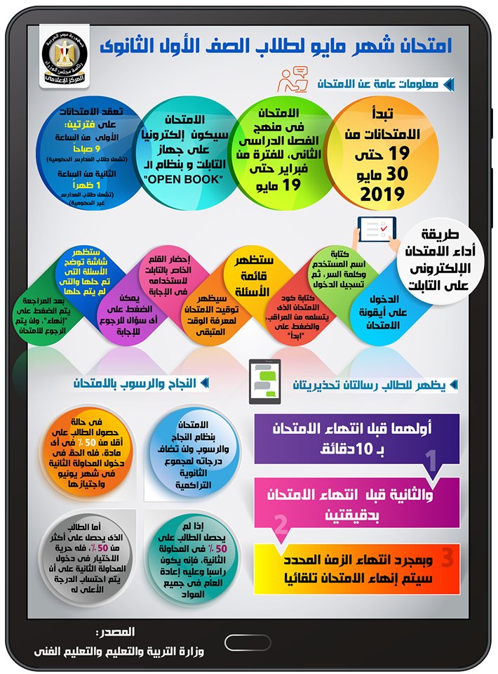 نشر المركز الإعلامي لمجلس الوزراء، إنفوجرافاً، اليوم، سلط من خلاله الضوء على أهم المعلومات المتعلقة بامتحان شهر مايو لطلاب الصف الأول الثانوي، معلناً أنه سيتم بدء الامتحانات من 19 حتى 30 مايو 2019، وسيكون إلكتروني على جهاز التابلت، بنظام الـ "open book"، فضلاً عن أنه سيكون في منهج الفصل الدراسي الثاني، للفترة من فبراير حتى 19 مايو.
