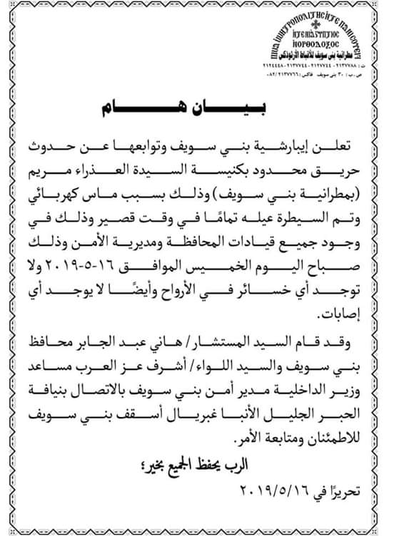 أكدت مطرانية بني سويف للأقباط الأرثوذكس، في بيان إعلامي لها اليوم الخميس، حول الحريق الذي شب بالمطرانية، والذي جاء فية الآتي "تعلن إيبارشية بني سويف وتوابعها عن حدوث حريق محدود بكنيسة السيدة العذراء مريم "بمطرانية بني سويف"، بسبب ماس كهربائي، وتمت السيطرة علية فى وقت قصير، ولا توجد أي خسائر في الأرواح ولا يوجد أي إصابات.
