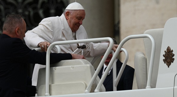 ولوح البابا للجماهير، وقد جلس على كرسي متحرك، خلال خروجه من مستشفى جيميلي حيث خضع للجراحة لمنع انسداد معوي.