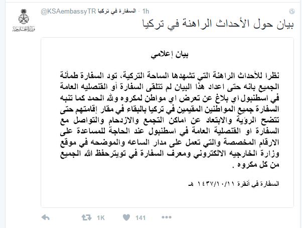 نشر الحساب الرسمي للسفارة السعودية في تركيا عبر تويتر بيانا يعلن فيه مستجدات الأوضاع بالنسبة للسعوديين المقيمين بتركيا.