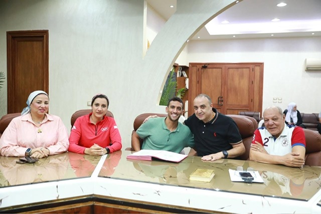جدد سامة أبوزيد رئيس نادي الشمس عقد البطل الأولمبي أحمد أسامة الجندي لاعب الخماسي الحديث والمتوج بذهبية أولمبياد باريس 2024 .