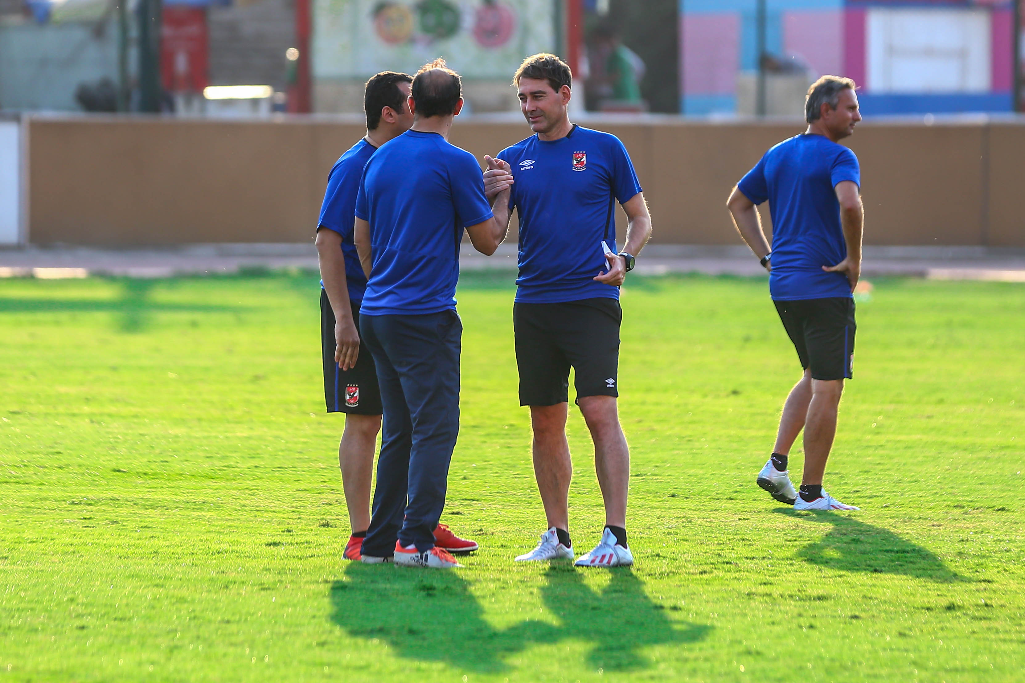 عقد السويسري رينيه فايلر المدير الفني للفريق الأول لكرة القدم بالنادي الأهلي جلسة خاصة مع جهازه المعاون على هامش مران الفريق الجماعي مساء اليوم الأربعاء على ملعب التتش بالجزيرة.