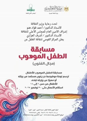 يعلن المركز القومى لثقافة الطفل التابع للمجلس، عن الدورة 36 من مسابقة الطفل الموهوب في مجال الفنون "الرسم"، وتهدف المسابقة إلى التعرف على المواهب الفنية لدى الطفل والعمل على إظهارها ومساعدته على تنمية تلك المواهب.