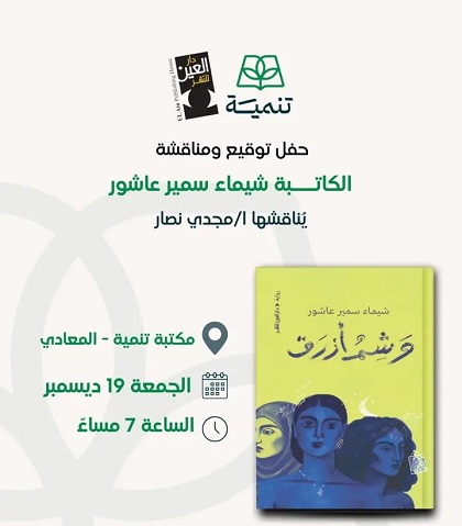 تستضيف مكتبة تنمية المعادي حفل توقيع ومناقشة رواية «وشم أزرق» للكاتبة شيماء سمير عاشور، الصادرة عن دار العين للنشر، ويناقشها الكاتب مجدي نصار، وذلك يوم الجمعة المقبل، في الساعة السابعة مساء.