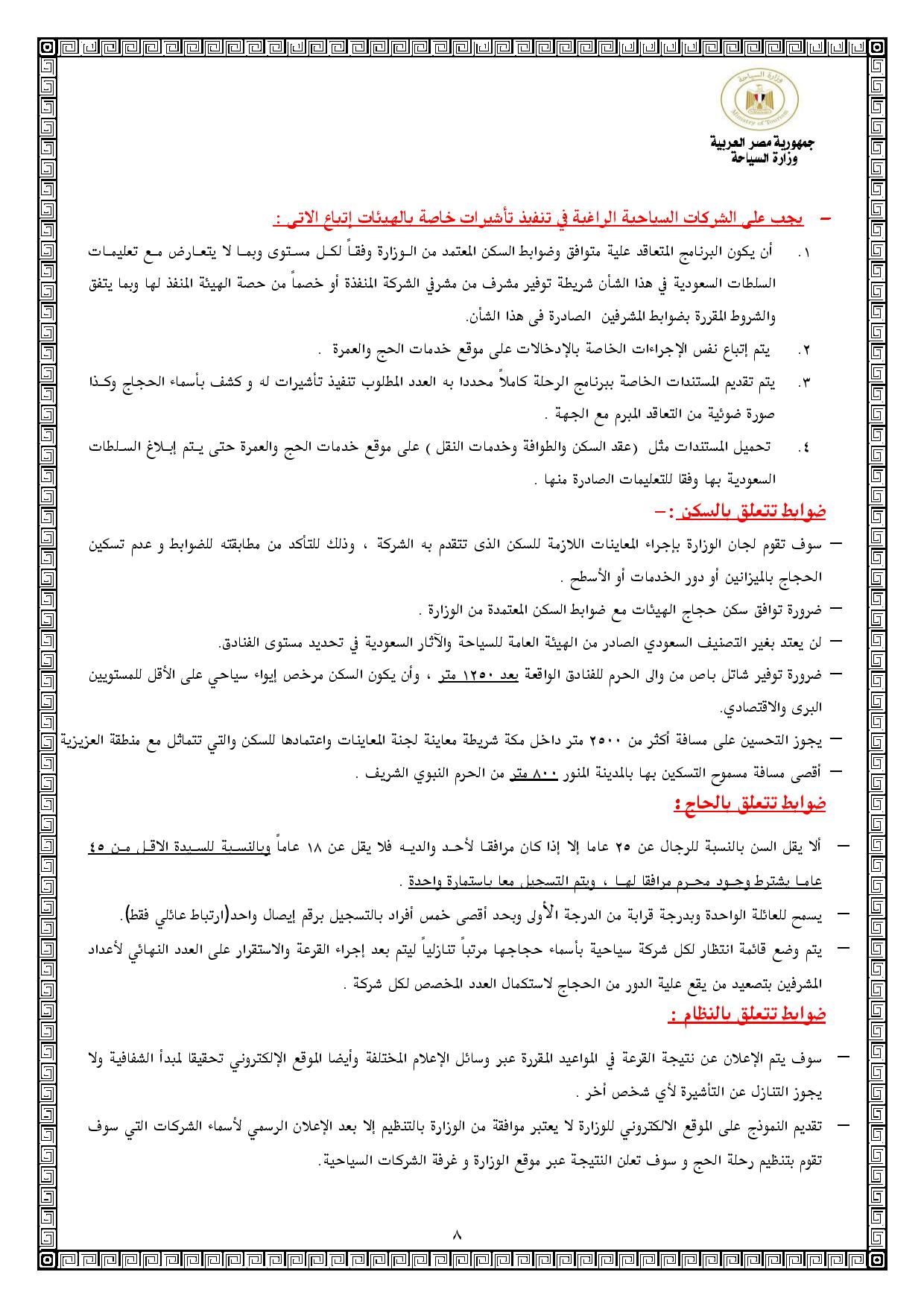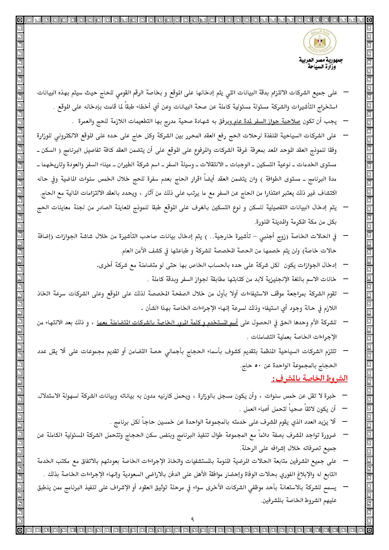 ونصت الضوابط على أن شركات المستوي الأول - التي يتجاوز حجم تنظيمها للحج أكثر من 9 سنوات - لها الحق في التقدم بـ80 جواز سفر فقط، و110 جوازات للمتقدمين للحج الاقتصادي (البري، والطيران)، علي أن يبلغ الحد الأقصي للجوازات المصرح بها لشركات المستوي "ب" - وهي الشركات التي لها سابق خبرة في تنظيم الحج بين 7-9 سنوات - 60 جوازا فقط للحج الفاخر (4، 5) نجوم، و80 جوازا فقط للحج الاقتصادي، وبالنسبة للشركات مستوي ج - وهي الشركات التي لها سابق خبرة من أول مرة وحتي 6 سنوات بحد أقصي - يبلغ 40 تأشيرة للحج الفاخر، و60 تأشيرة للحج الاقتصادي.