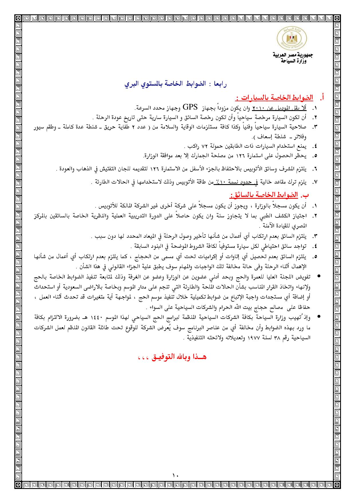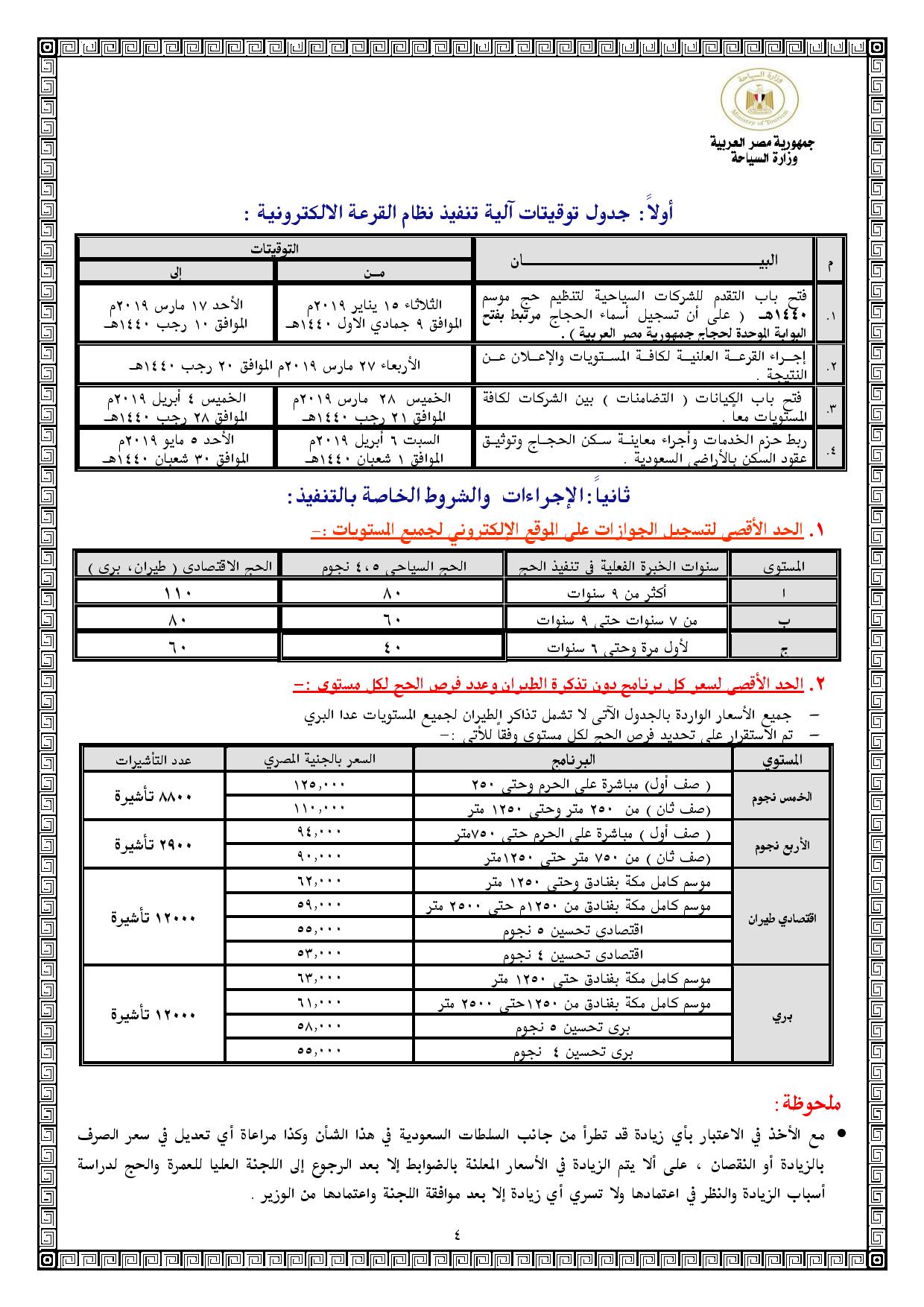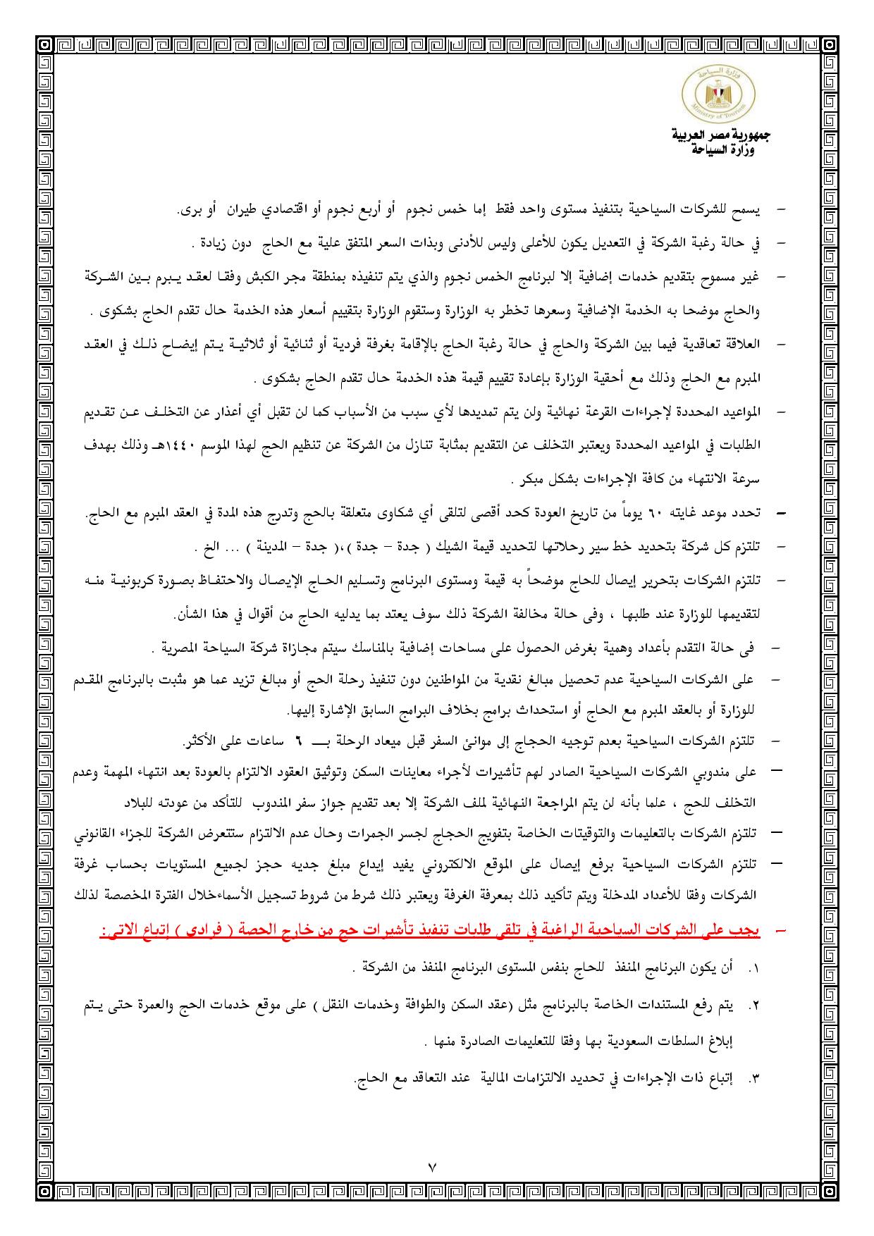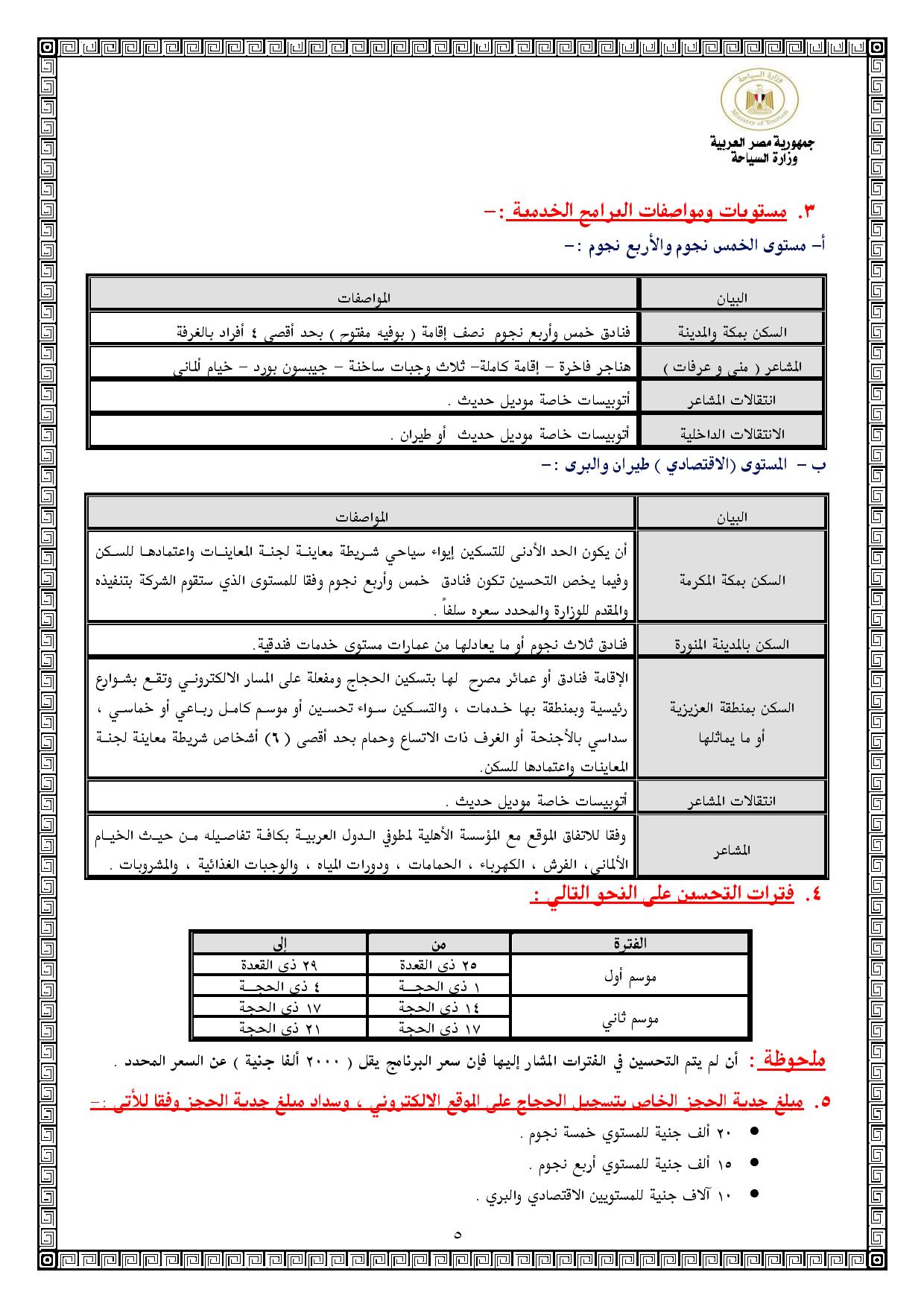 كما اشترطت أن يتم دفع 20 ألف كجدية حجز للمستوي الخمس نجوم، و15 ألف للمستوي أربع نجوم، و10 آلاف للمستويين الاقتصادي والبري.