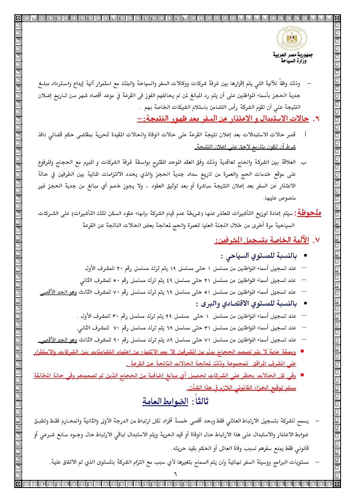 وحسب الضوابط التي أقرتها وزارة السياحة فإن الحد الأقصي للتأشيرات المتاحة للمستوي خمس نجوم يبلغ 8800 تأشيرة، والأربع نجوم 2900 تأشيرة، والاقتصادي 12 ألف تأشيرة، والبري 12 ألف تأشيرة.