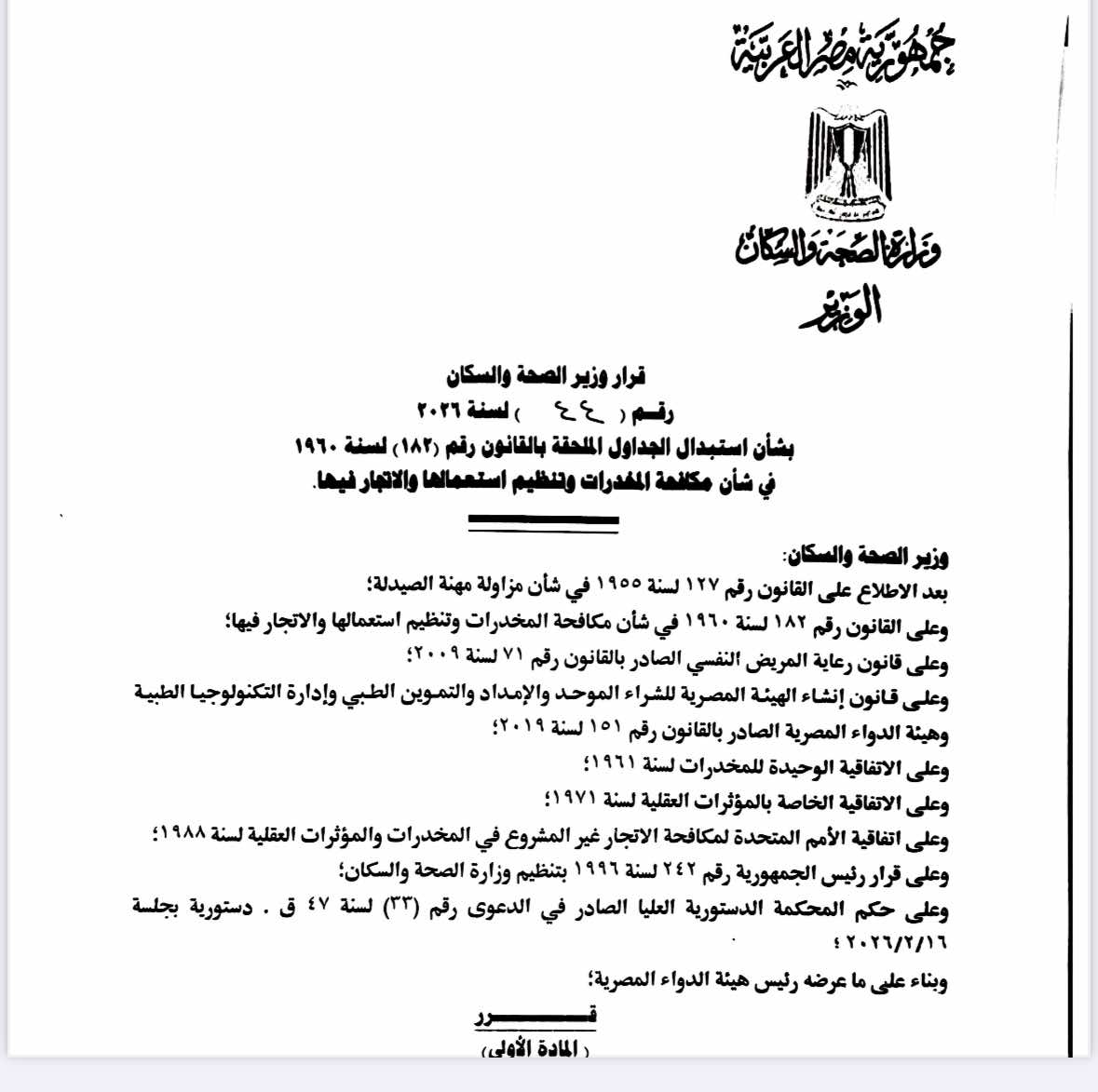 أصدر الدكتور خالد عبدالغفار، وزير الصحة والسكان، قراراً وزارياً عاجلاً، يحمل الرقم (44) لسنة 2026، باستبدال الجداول الملحقة بقانون مكافحة المخدرات وتنظيم استعمالها والاتجار فيها رقم (182) لسنة 1960.