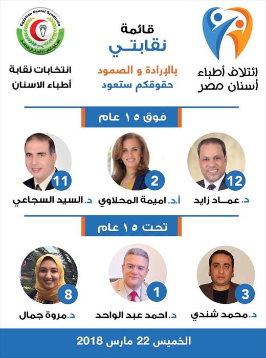 وأضاف «زايد»، أنه يشارك في قائمة «نقابتي»، عماد زايد فوق السن رقم 12، مساعد مدير طب الأسنان بقليوب حاليا، أميمة المحلاوي فوق السن رقم 2، أستاذ التركيبات الثابتة بكلية طب الأسنان جامعة القاهرة وعميدة كلية طب الأسنان جامعة جنوب الوادي، السيد السجاعي فوق السن رقم 11، مدير عام التأمين الصحي بسمنود غربية.