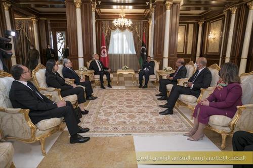 استقبل رئيس المجلس الرئاسي الليبي محمد المنفي ونائبيه عبدالله اللافي و موسى الكوني، الرئيس التونسي قيس سعيد، الذي أدى زيارة رسمية إلى ليبيا اليوم الأربعاء.