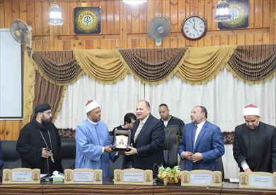 وفي نهاية الاحتفالية، تسلم اللواء عصام سعد محافظ أسيوط درع تذكاري من الدكتور محمد الدكتور محمد عبد المالك نائب رئيس جامعة الازهر للوجه القبلي.