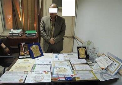 وعقب تقنين الإجراءات، تم ضبط المذكور حال تردده على ديوان إحدى الوزارات، لمقابلة أحد كبار مسئوليها، وبحوزته الآتي: «شهادة درجة الدكتوراه منسوبة لأكاديمية دولية تفيد منح المتهم، بصفته (مستشار إعلامي) درجة الدكتوراه بتقدير عام امتياز مع مرتبة الشرف في مجال الإعلام وتنمية موارد المجتمع المدني (مزورة)، شهادة دكتوراه منسوبة لأكاديمية دولية تفيد منح المتهم درجة الدكتوراه في مجال السياحة والتنمية (مزورة بالكامل) - شهادة علمية منسوبة لجامعة دولية بالقاهرة بإسم المتهم تفيد منحة دورة علمية تدريبية في إدارة الأعمال (مزورة) - شهادة منسوبة لمنظمة عربية بإسم المتهم تفيد منحه لقب سفيرًا للمنظمة لمجهوداته في بث روح الحب والسلام بين الشعوب العربية (مزورة) - شهادة تقدير منسوبة لمنظمة عربية أخرى باسم المتهم لاختيارة سفيرًا للسلام بالوطن العربي (مزورة)».