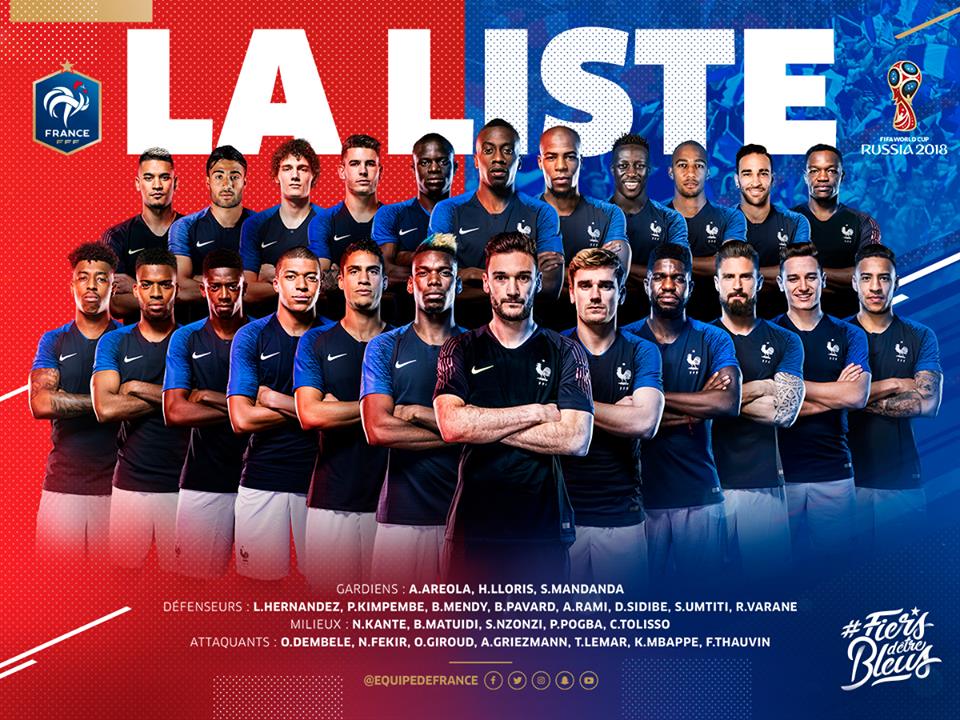 أعلن دييديه ديشان، مدرب المنتخب الفرنسي لكرة القدم، اليوم الخميس، قائمة الفريق الملقب بـ(الديوك) المشاركة في نهائيات كأس العالم المقرر انطلاقها في روسيا منتصف الشهر المقبل.