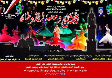 يعقد قطاع شئون الإنتاج الثقافي برئاسة المخرج خالد جلال، لقائه الشهرى لملتقى الهناجر الثقافى، بعنوان "رمضان ومحبة الأوطان"، وذلك فى الساعة التاسعة من مساء يوم الاثنين المقبل، بمركز الهناجر للفنون.