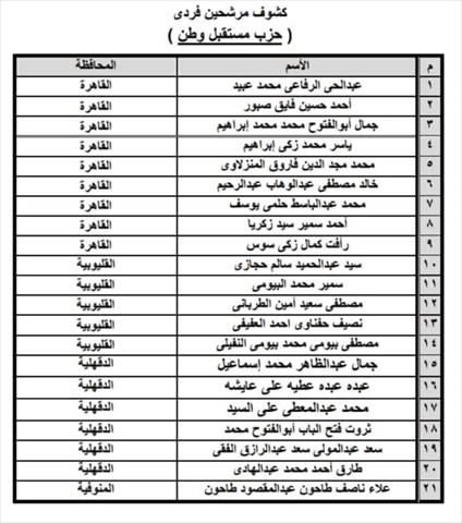 وجاء أبرز أسماء المرشحين للحزب وهم : عبدالحى عبيد، أحمد فايق صبور، جمال أبو الفتوح، ياسر زكى، محمد مجد المنزلاوى، خالد عبدالرحيم، محمد حلمى يوسف، أحمد سمير زكريا، رأفت زكى سوس.