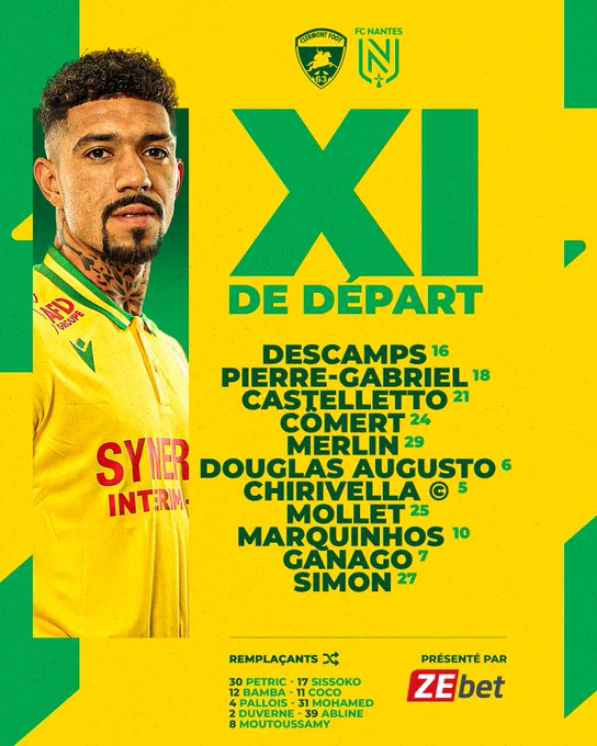 أعلن بيير أريستوي، المدير الفني لنانت، تشكيل فريقه لمباراة كليرمون فوت، اليوم الأحد، على ملعب جبريل مونتبيد، ضمن منافسات الجولة الخامسة من الدوري الفرنسي.