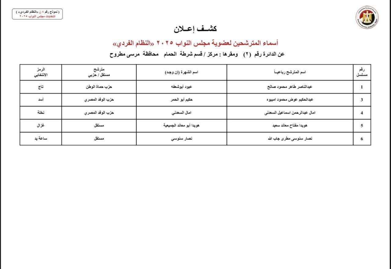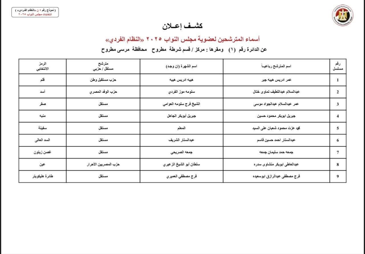 وتضمنت كشوف المرشحين على النظام الفردي في محافظة مرسى مطروح 15 مرشحًا سيتنافسون على مقعدين في دائرتين انتخابيتين.